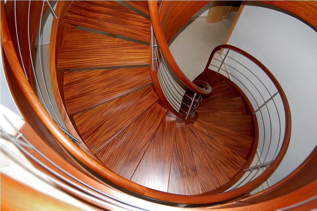 Ażurowe schody na policzkach giętych SP010 Ażurowe schody na policzkach giętych. Balustrada stal nierdzewna z drewnianym pochwytem. Drewno mahoń sapeli. Projekt i wykonanie Schody Prudlik. Model: SP010