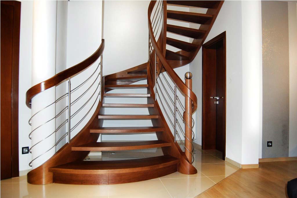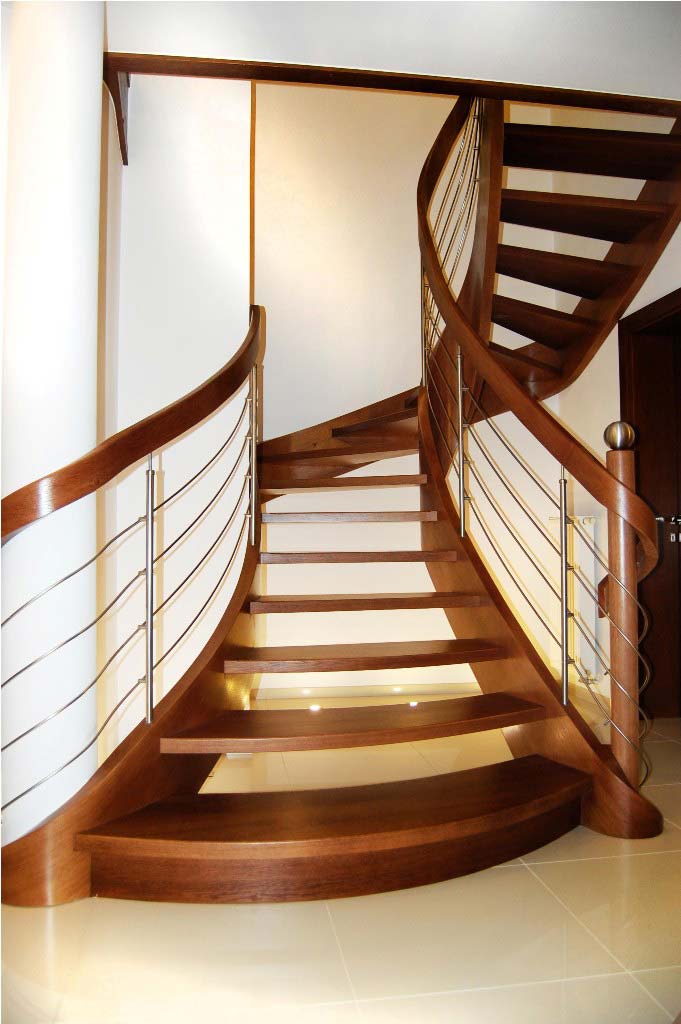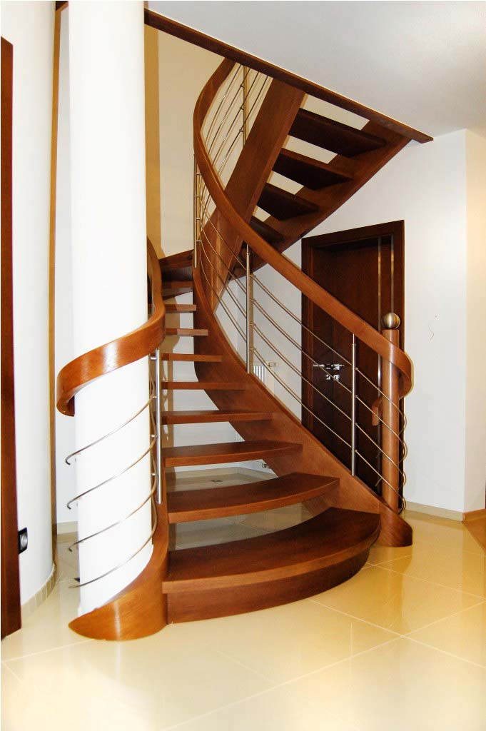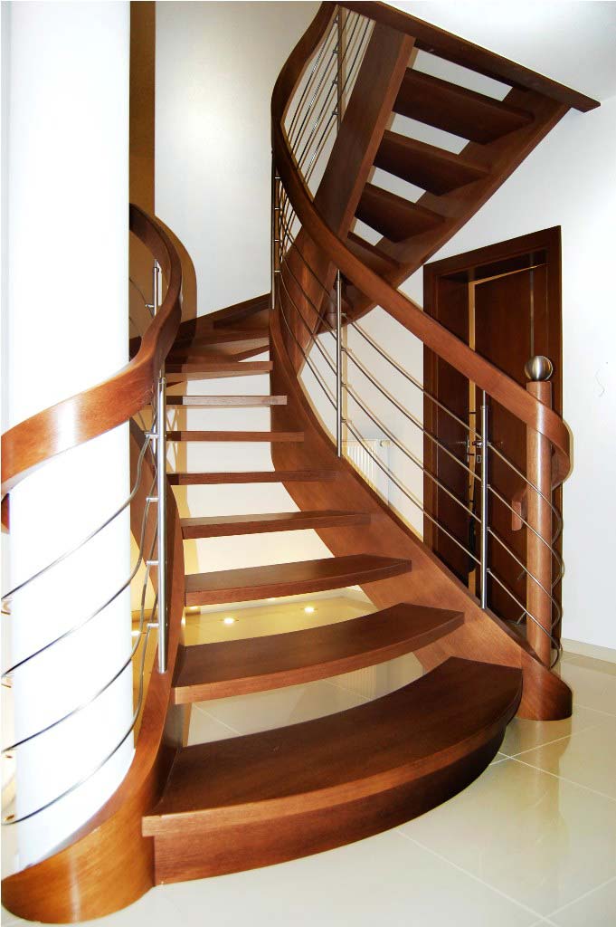 Ażurowe schody na policzkach giętych SP031 Ażurowe schody na policzkach giętych. Balustrada stal nierdzewna z drewnianym pochwytem. Drewno dąb bejcowany. Projekt i wykonanie Schody Prudlik. Model: SP031