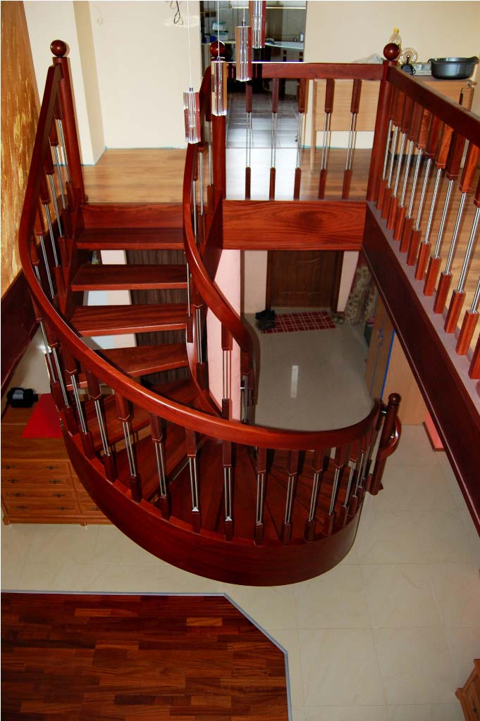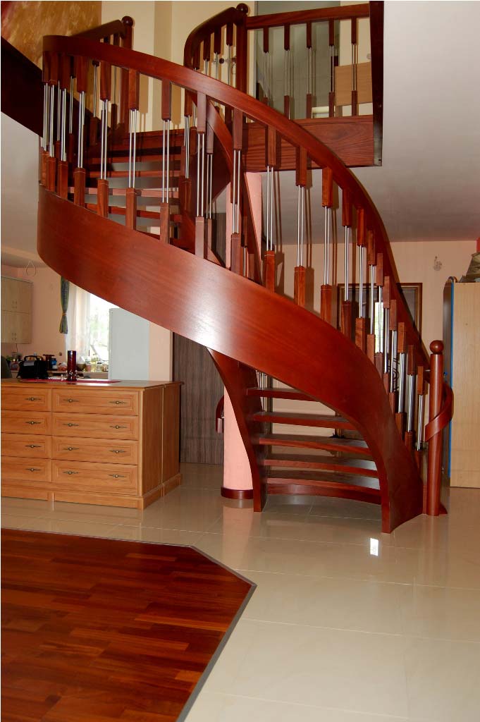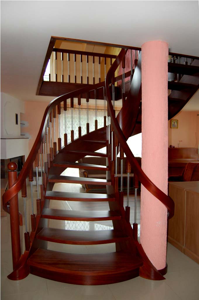 Ażurowe schody na policzkach giętych SP055 Ażurowe schody na policzkach giętych. Balustrada tralki łączące stal szlachetną i drewno. Drewno mahoń sapeli. Projekt i wykonanie Schody Prudlik. Model: SP055