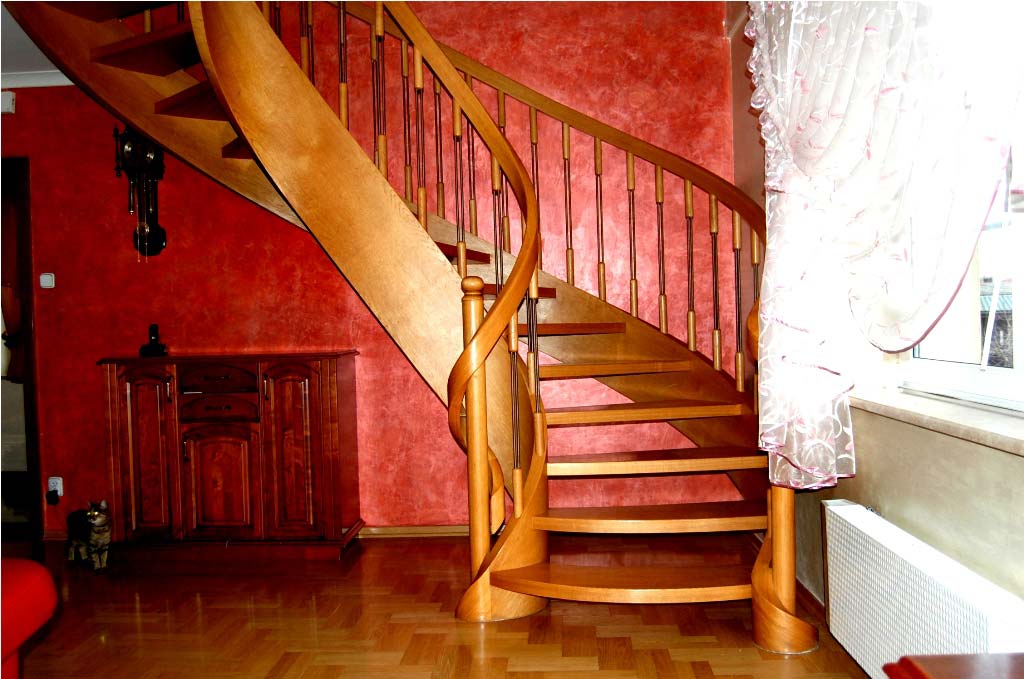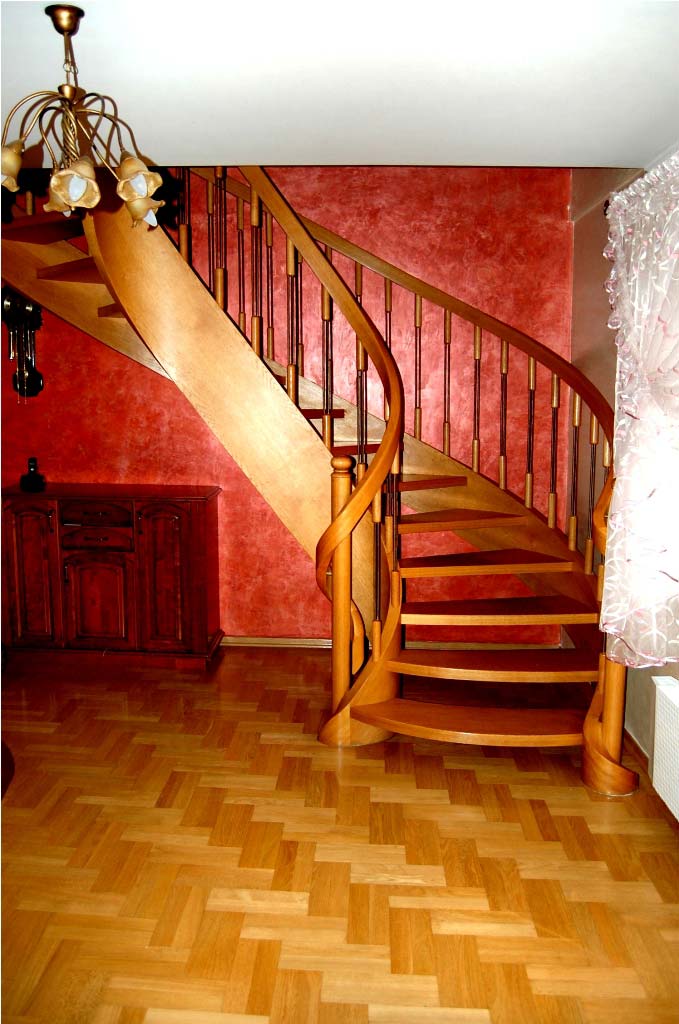 Ażurowe schody na policzkach giętych SP058 Ażurowe schody na policzkach giętych. Balustrada tralki łączące stal szlachetną z drewnem. Drewno dąb. Projekt i wykonanie Schody Prudlik. Model: SP058