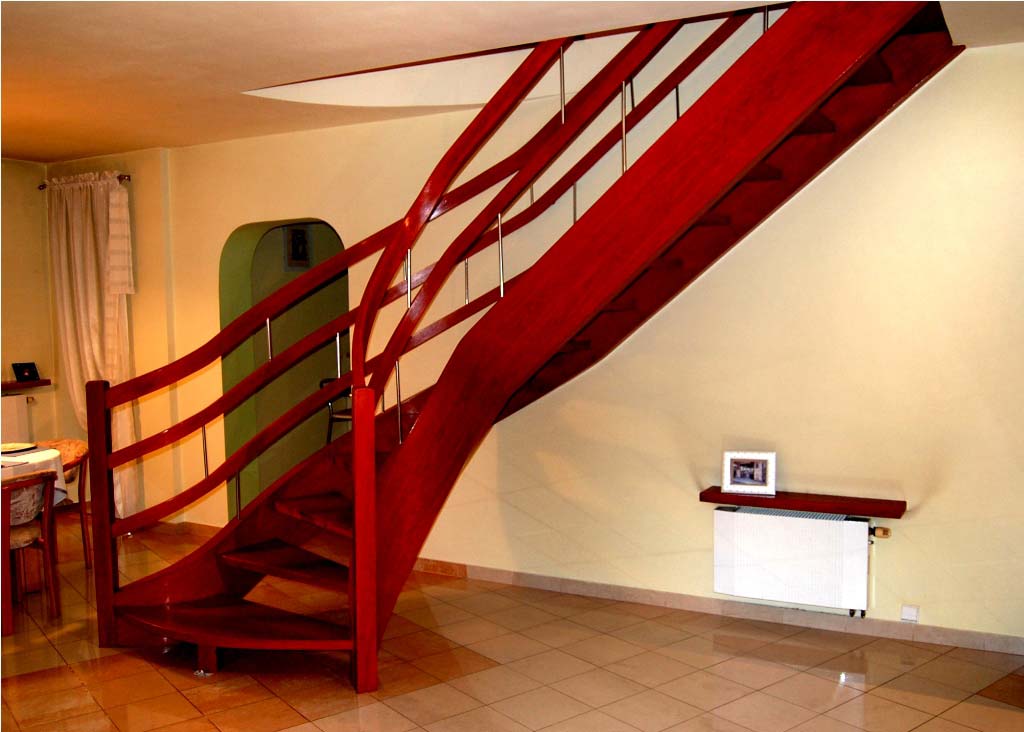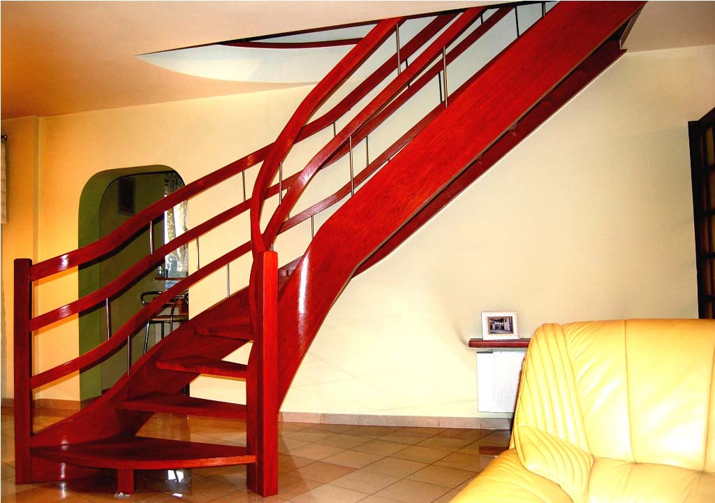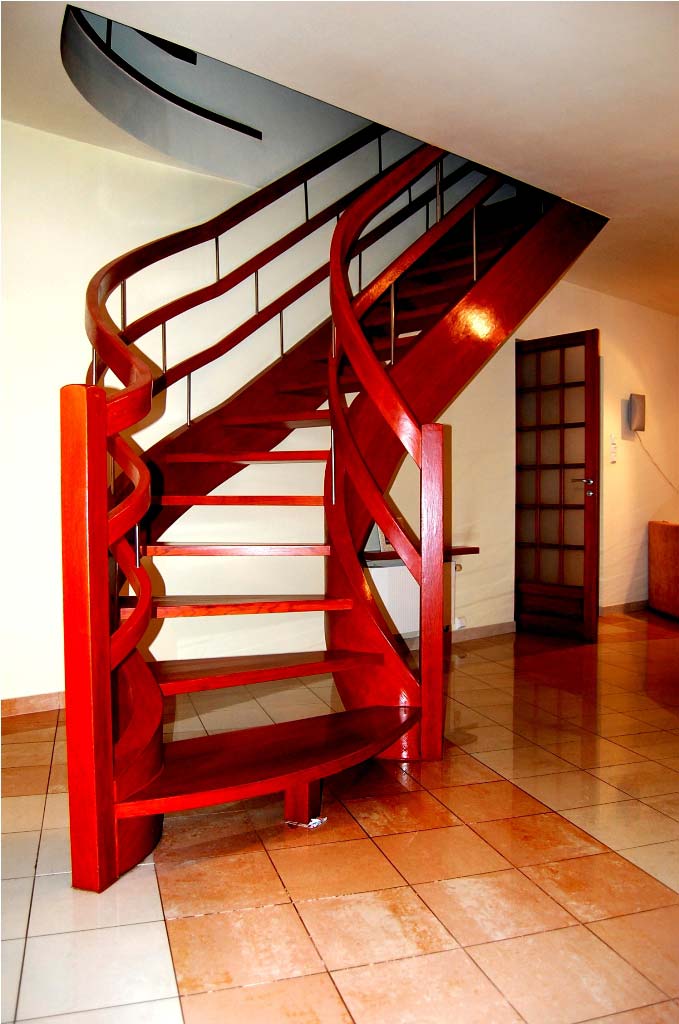 Ażurowe schody na policzkach giętych SP063 Ażurowe schody na policzkach giętych. Balustrada łącząca drewno i stal szlachetną. Drewno dąb. Projekt i wykonanie Schody Prudlik. Model: SP063