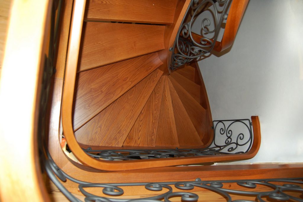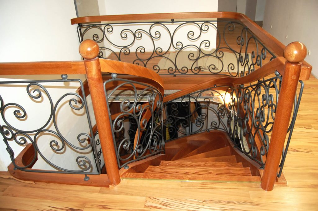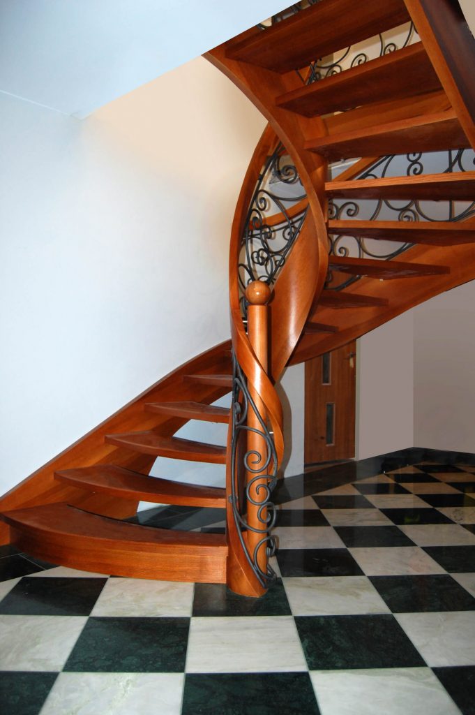 Drewno Dąb barwiony SP90 Schody ażurowe na policzkach giętych typu C Drewno: Dąb bejcowany Balustrada: Kowalstwo artystyczne Pochwyt: Drewniany Projekt i wykonanie: Schody Prudlik