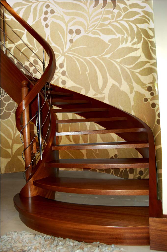 Jednozabiegowe schody ażurowe na policzkach giętych SP059 Jednozabiegowe schody ażurowe na policzkach giętych. Balustrada stal nierdzewna. Drewno mahoń sapeli. Projekt i wykonanie Schody Prudlik. Model: SP059