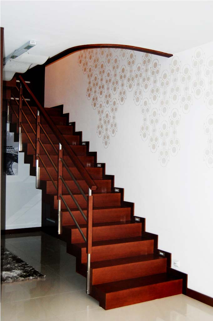 Nowoczesne schody dywanowe SP021 Nowoczesne schody dywanowe. Balustrada stal szlachetna z drewnianym pochwytem. Oświetlenie LED. Drewna dąb bejcowany. Projekt i wykonanie Schody Prudlik. Model: SP021