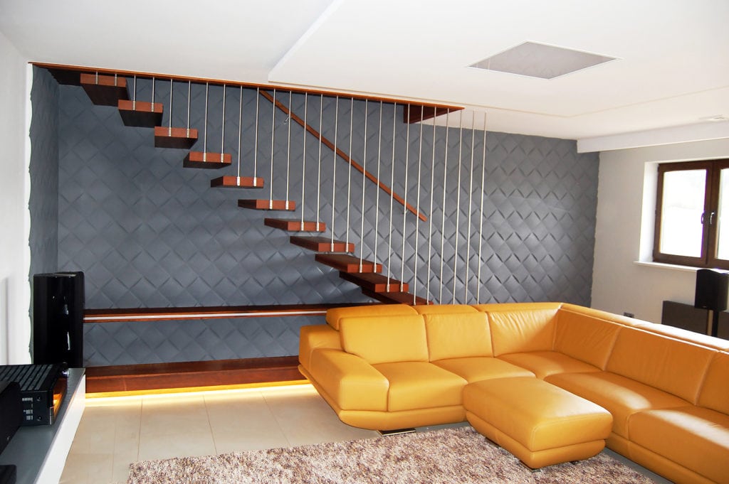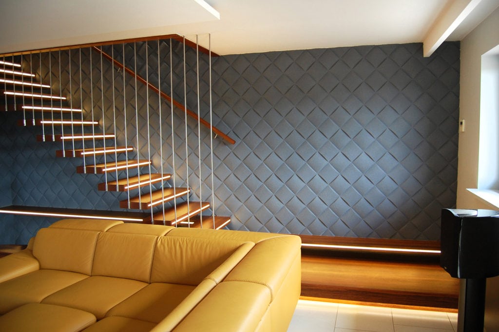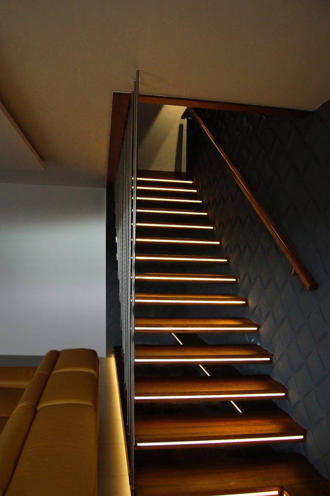 Nowoczesne schody dywanowe z taśmą LED SP083 Nowoczesne schody dywanowe z taśmą LED Balustrada: nowoczesne. Merbau,drewno egzotyczne. Projekt i wykonanie Schody Prudlik. Model: SP083