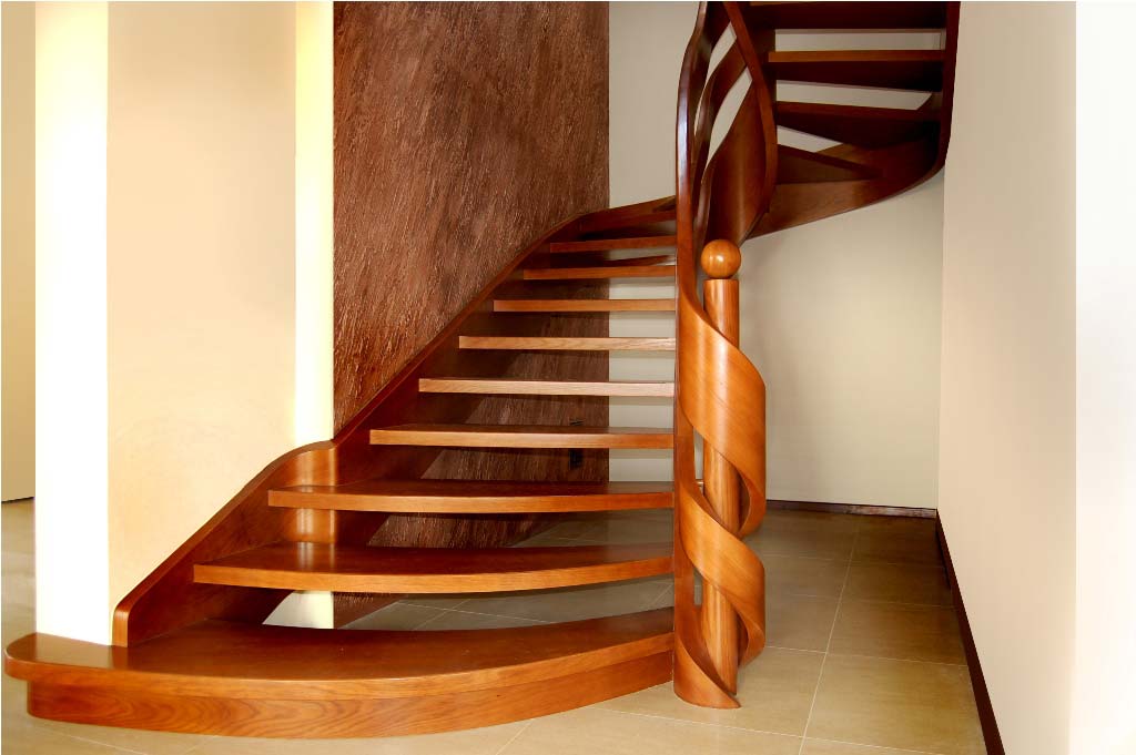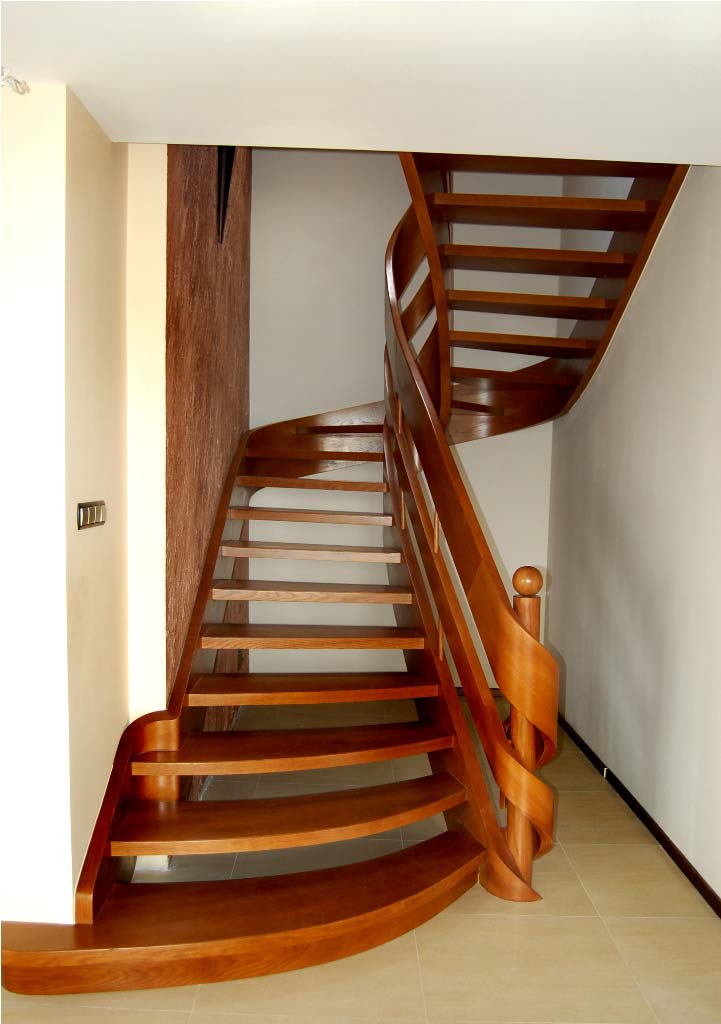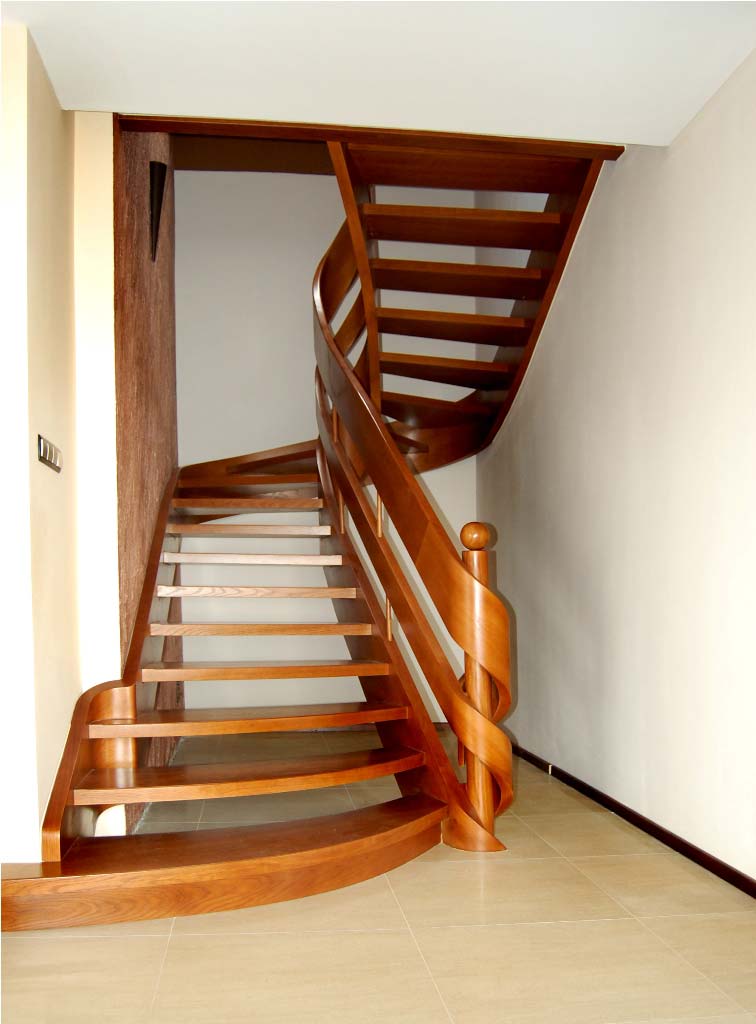 Schody ażurowe na policzkach giętych SP022 Schody ażurowe na policzkach giętych. Balustrada wstęgowa. Drewno dąb bejcowany. Projekt i wykonanie Schody Prudlik. Model: SP022