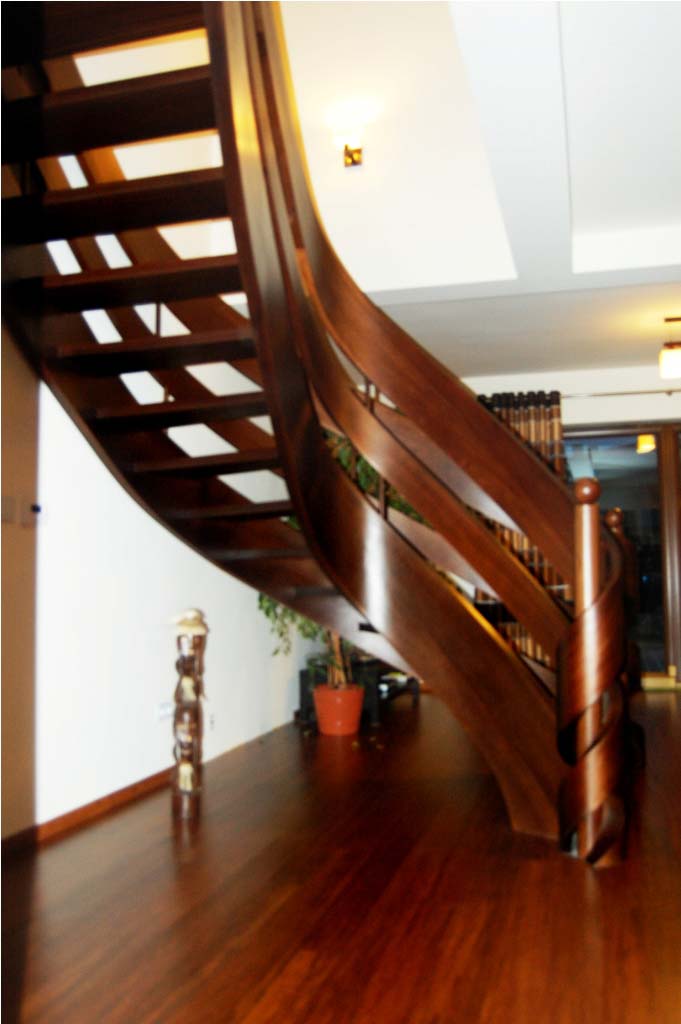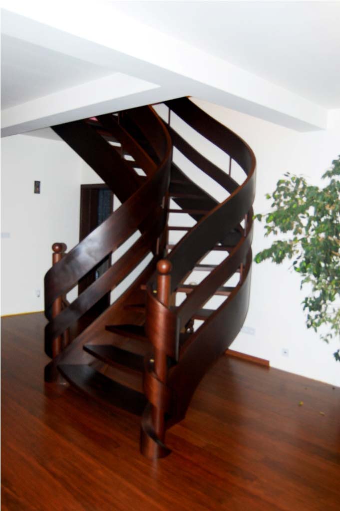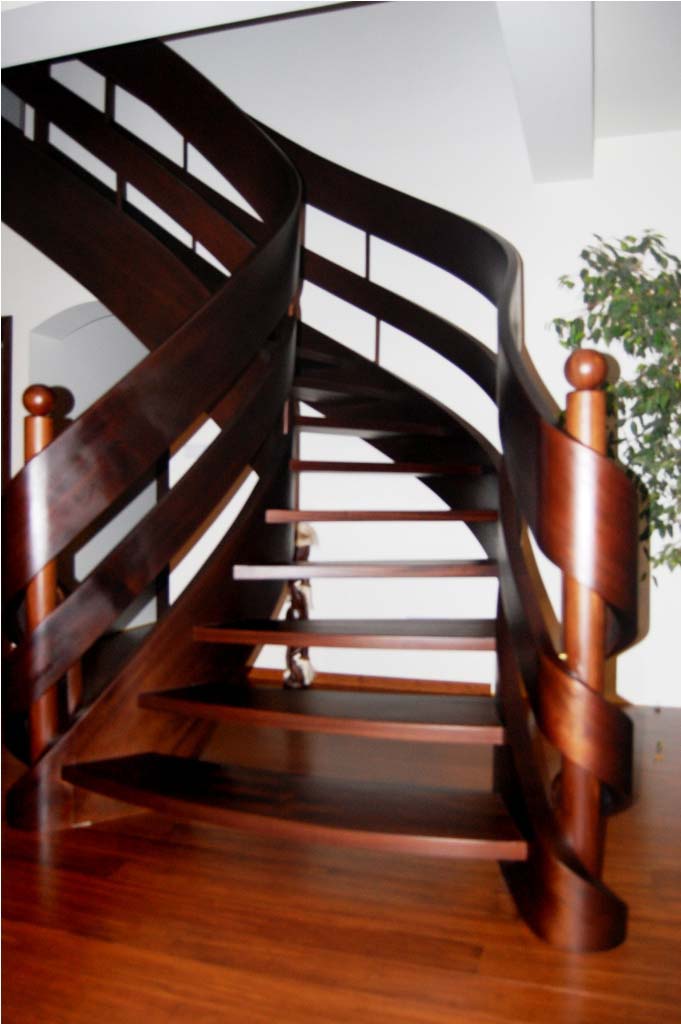 Schody ażurowe na policzkach giętych SP042 Schody ażurowe na policzkach giętych. Balustrada wstęgowa. Drewno mahoń sapeli. Projekt i wykonanie Schody Prudlik. Model: SP042