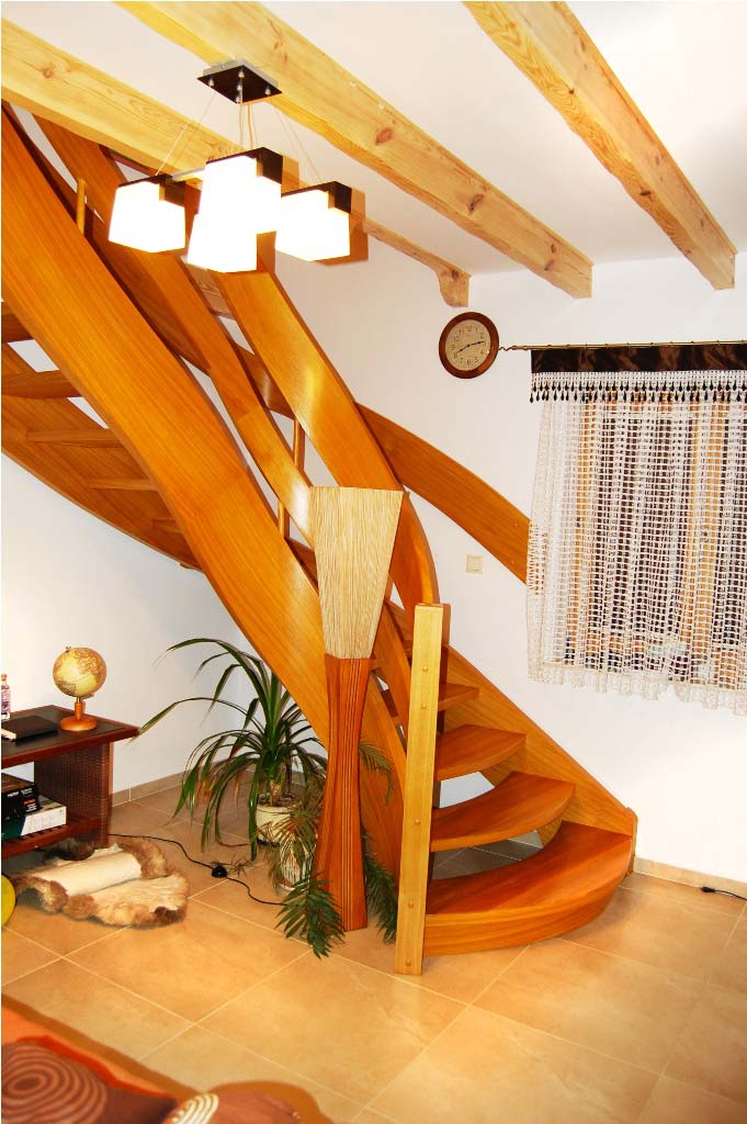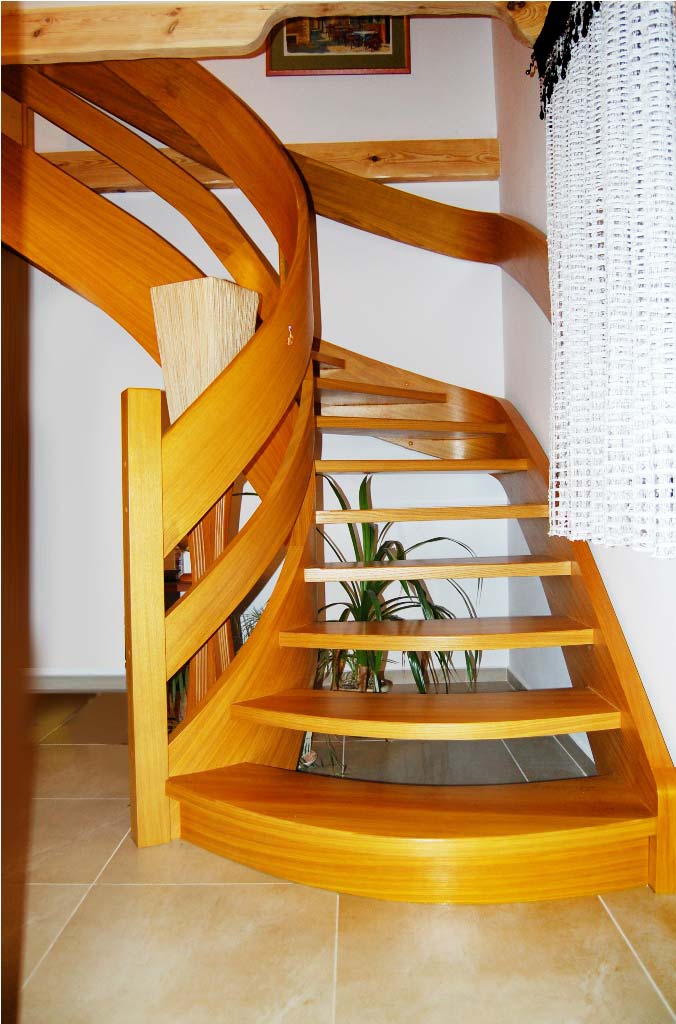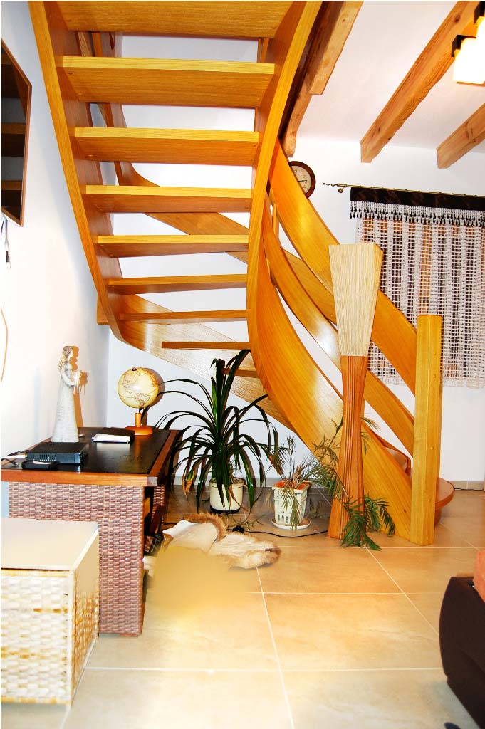 Schody ażurowe na policzkach giętych SP045 Schody ażurowe na policzkach giętych. Balustradą wstęgowa. Drewno dąb bejcowany. Projekt i wykonanie Schody Prudlik. Model: SP045