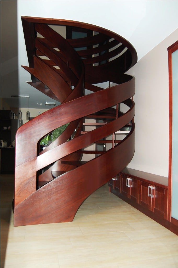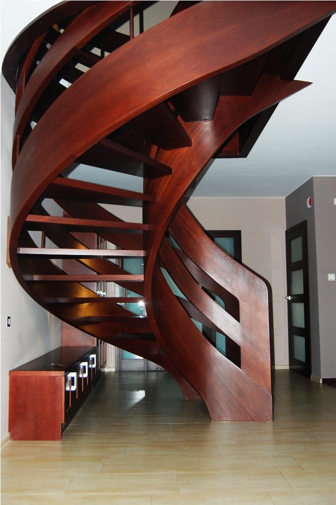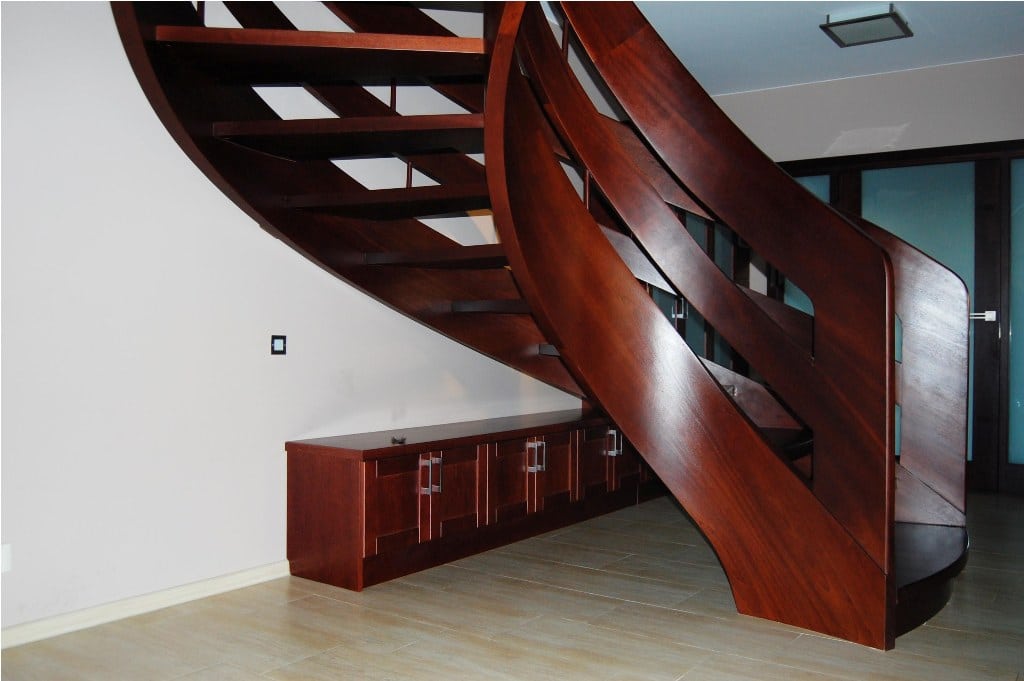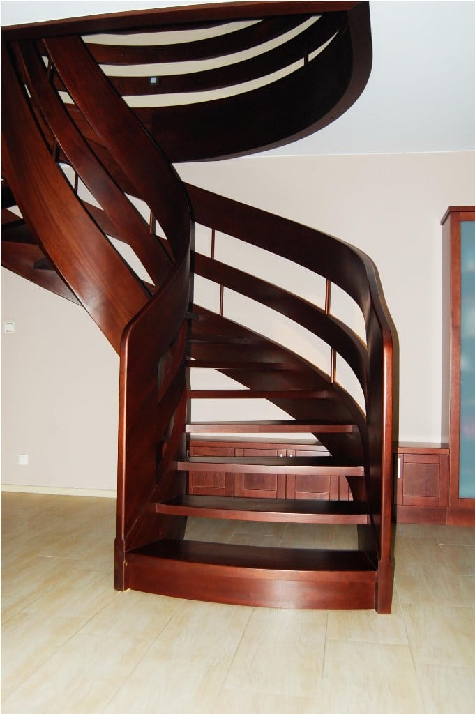Schody ażurowe na policzkach giętych SP049 Schody ażurowe na policzkach giętych. Balustrada wstęgowa. Drewno Mahoń sapeli. Projekt i wykonanie Schody Prudlik. Model: SP049