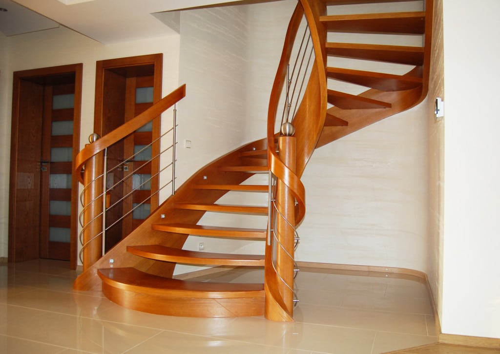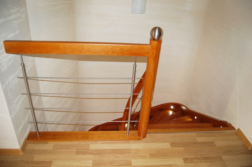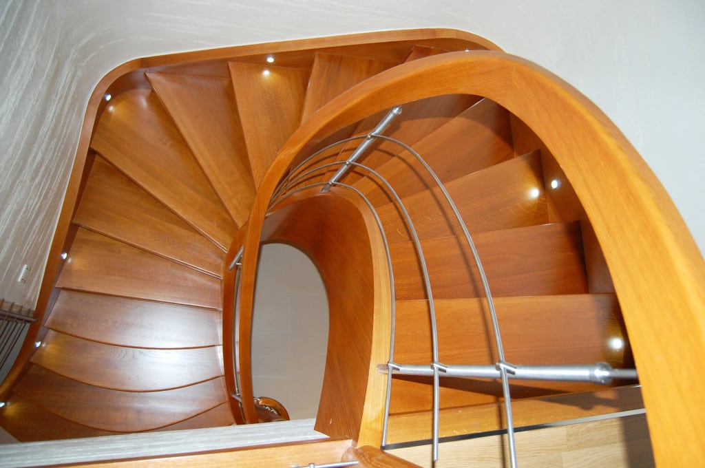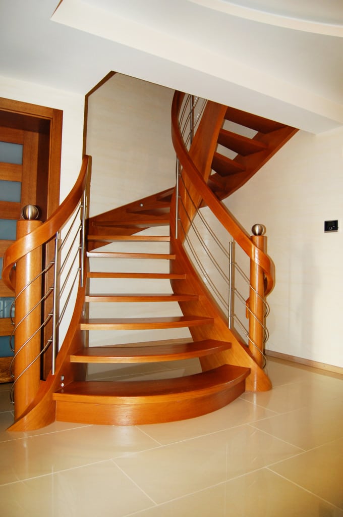 Schody ażurowe na policzkach giętych SP075 Ażurowe schody na policzkach giętych. Balustrada stal nierdzewna z drewnianym pochwytem. Projekt i wykonanie Schody Prudlik. Model: SP075