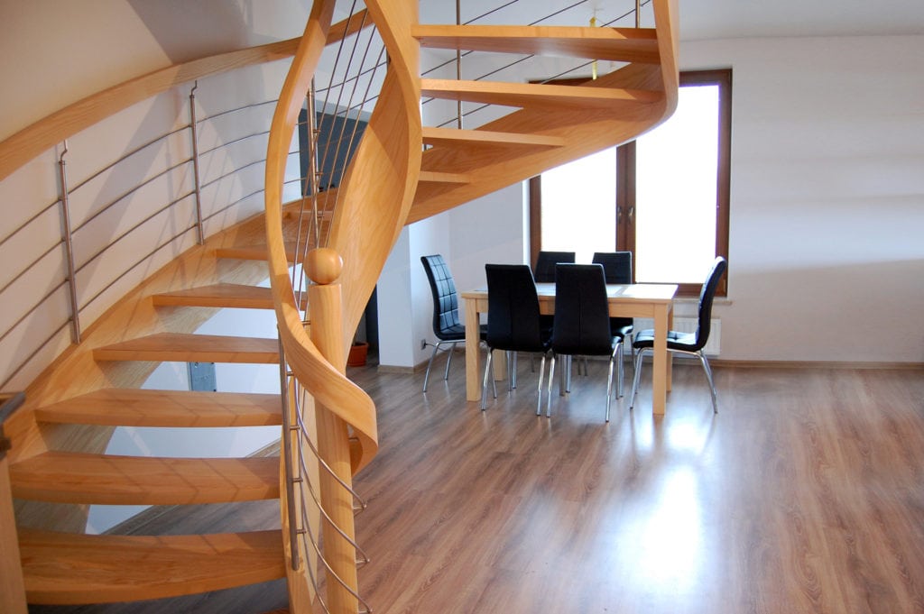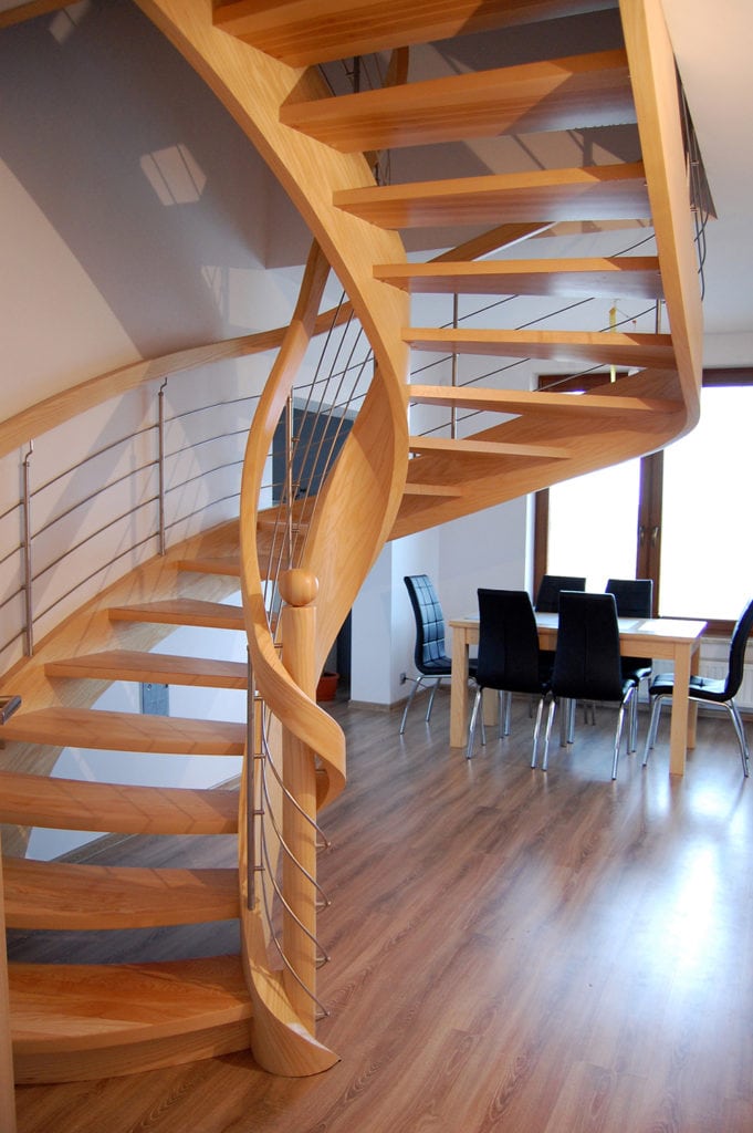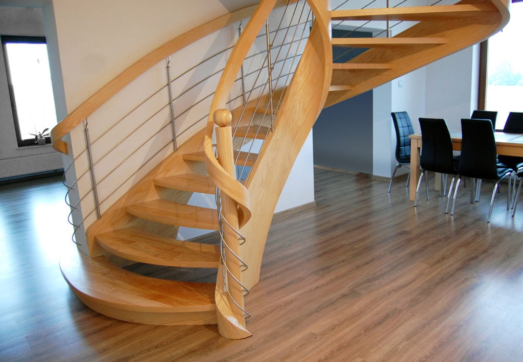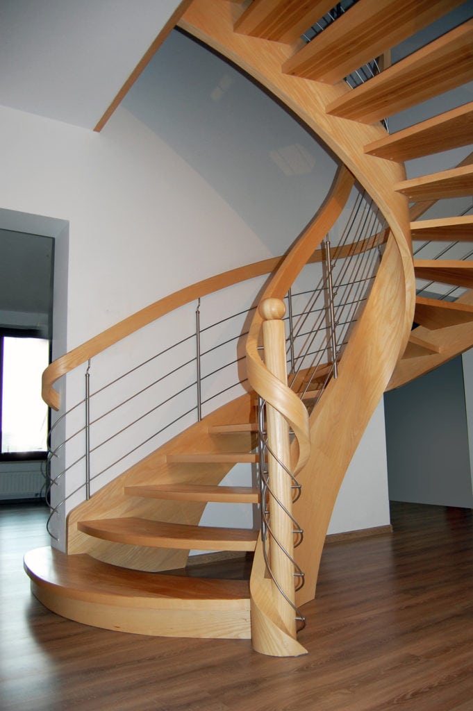 Schody ażurowe na policzkach giĘtych SP079 Ażurowe schody na policzkach giętych. Tralki z giętą balustradą. Drewno jesion. Projekt i wykonanie Schody Prudlik. Model: SP079