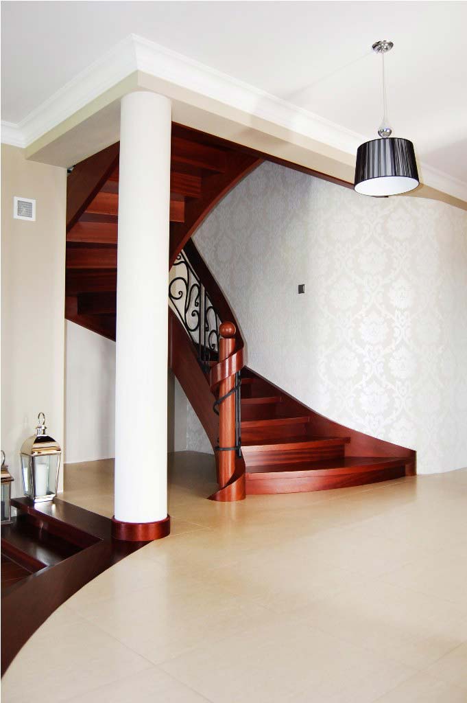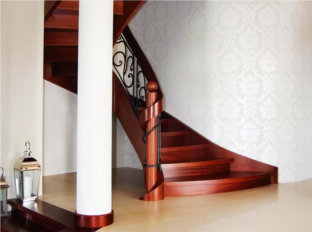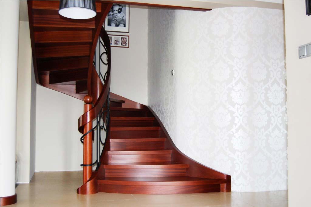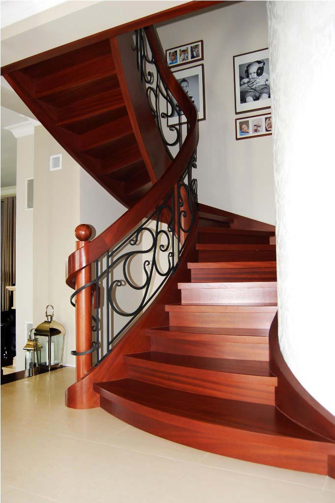 Schody na policzkach giętych SP014 Schody na policzkach giętych. Balustrada kowalstwo artystyczne z pochwytem drewnianym. Drewno mahoń sapeli. Projekt i wykonanie Schody Prudlik. Model: SP014