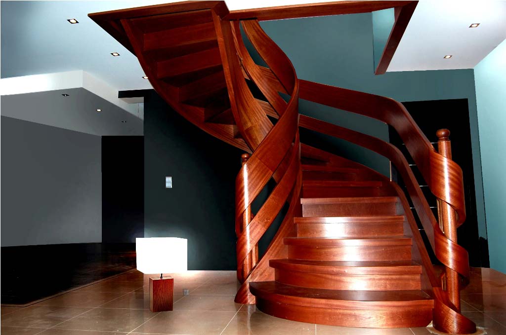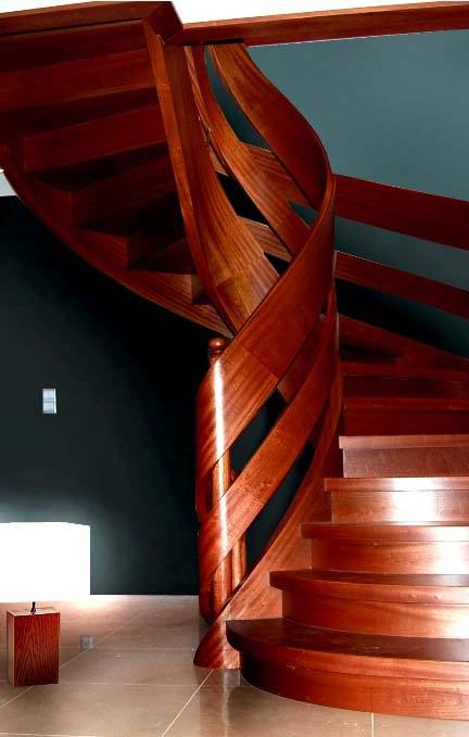 Schody na policzkach giętych SP061 Schody na policzkach giętych. Balustrada wstęgowa. Drewno Mahoń sapeli. Projekt i wykonanie Schody Prudlik. Model: SP061