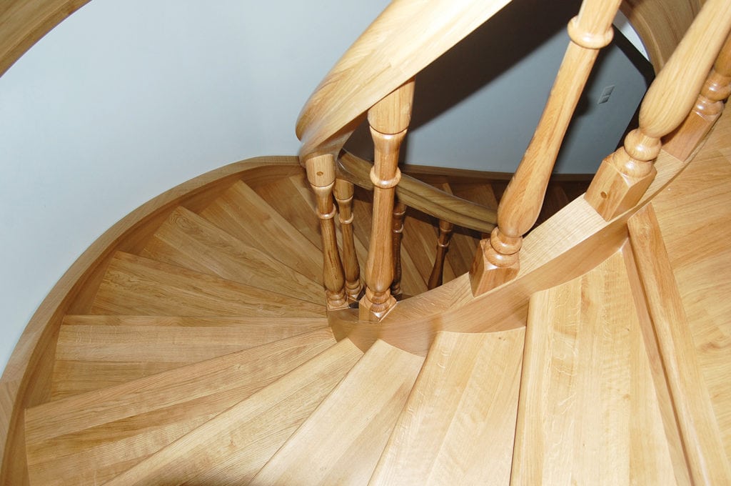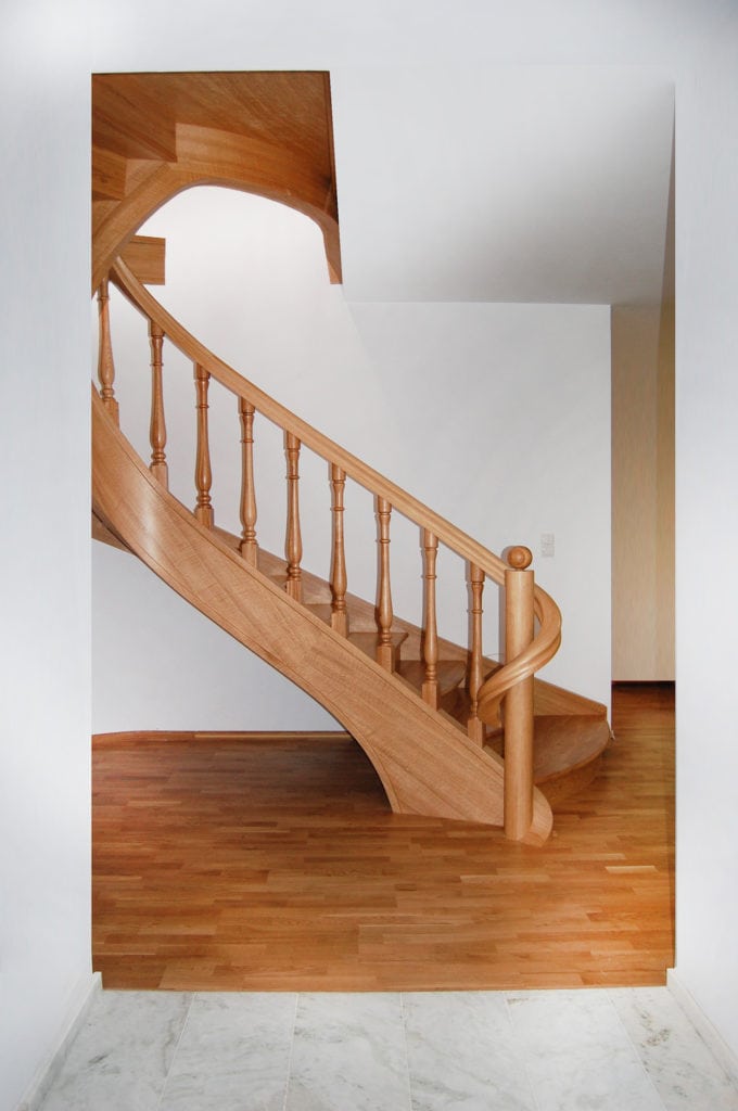 Schody na policzkach giętych SP076 Schody na policzkach giętych. Tralki z giętą balustradą. Drewno dąb naturalny. Projekt i wykonanie Schody Prudlik. Model: SP076